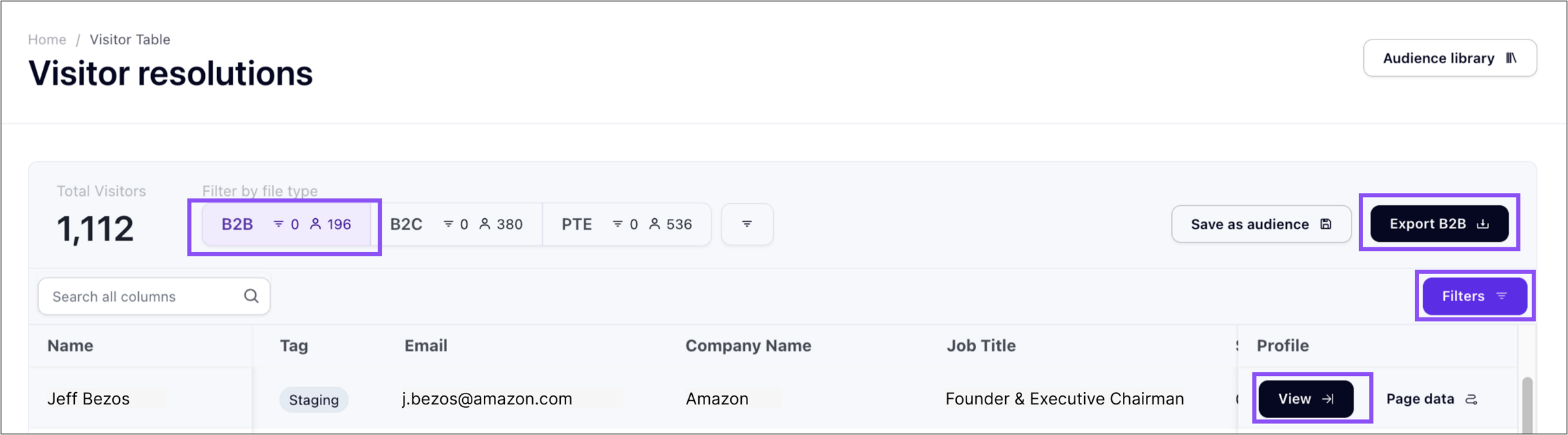 Toggle between visitors based on file types: “B2B”, “B2C” or “PTE”: