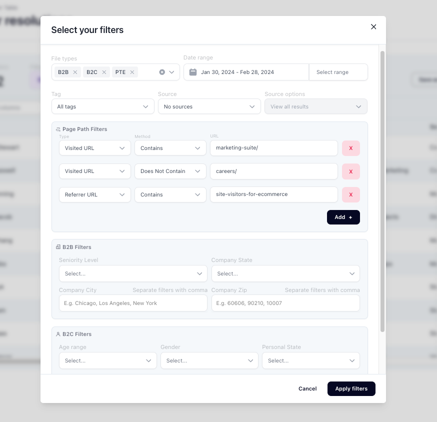 File types Filtering: Select which file types you would like to include in your audience. Options include B2B, B2C, and PTE.