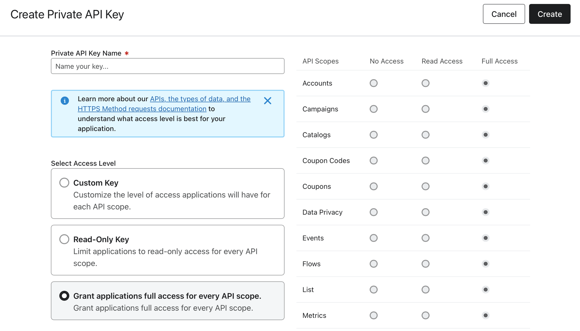 Toggle back to your Klaviyo account. In the section titled “Private API Keys” click the button