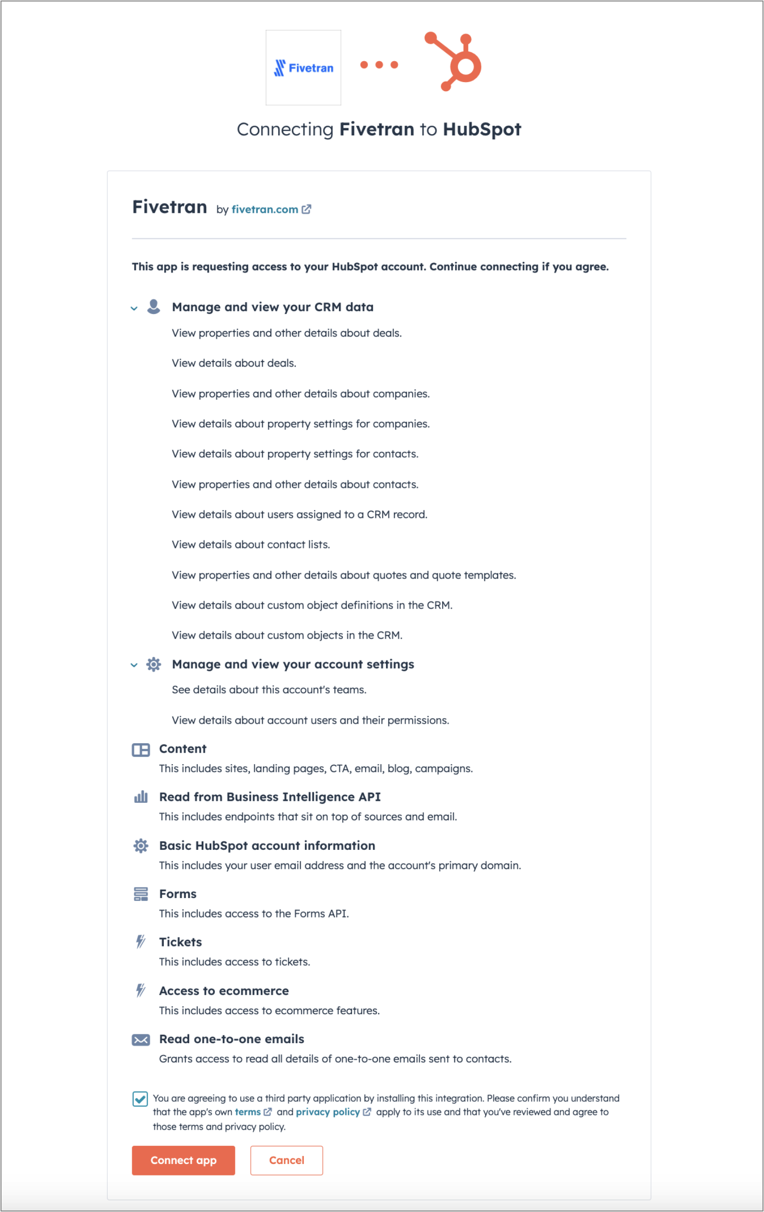 Click Connect App to allow the ETL tool Fivetran to connect to your Hubspot Account. When authorization is complete, you should be redirected back to the Untitled > Hubspot setup form.