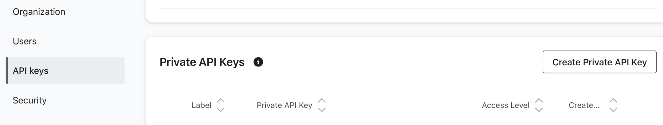 In the section titled “Private API Keys” click the button Create Private API Key.