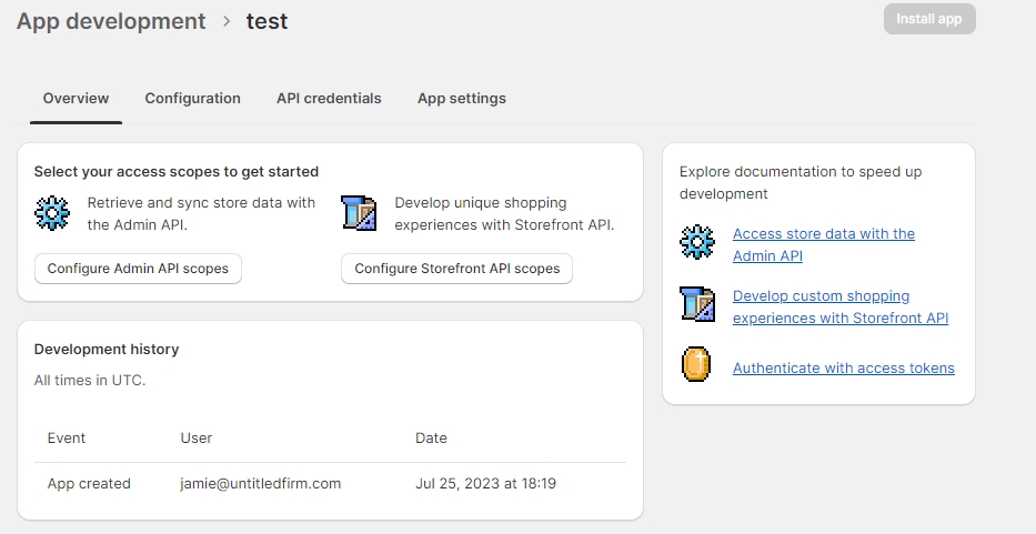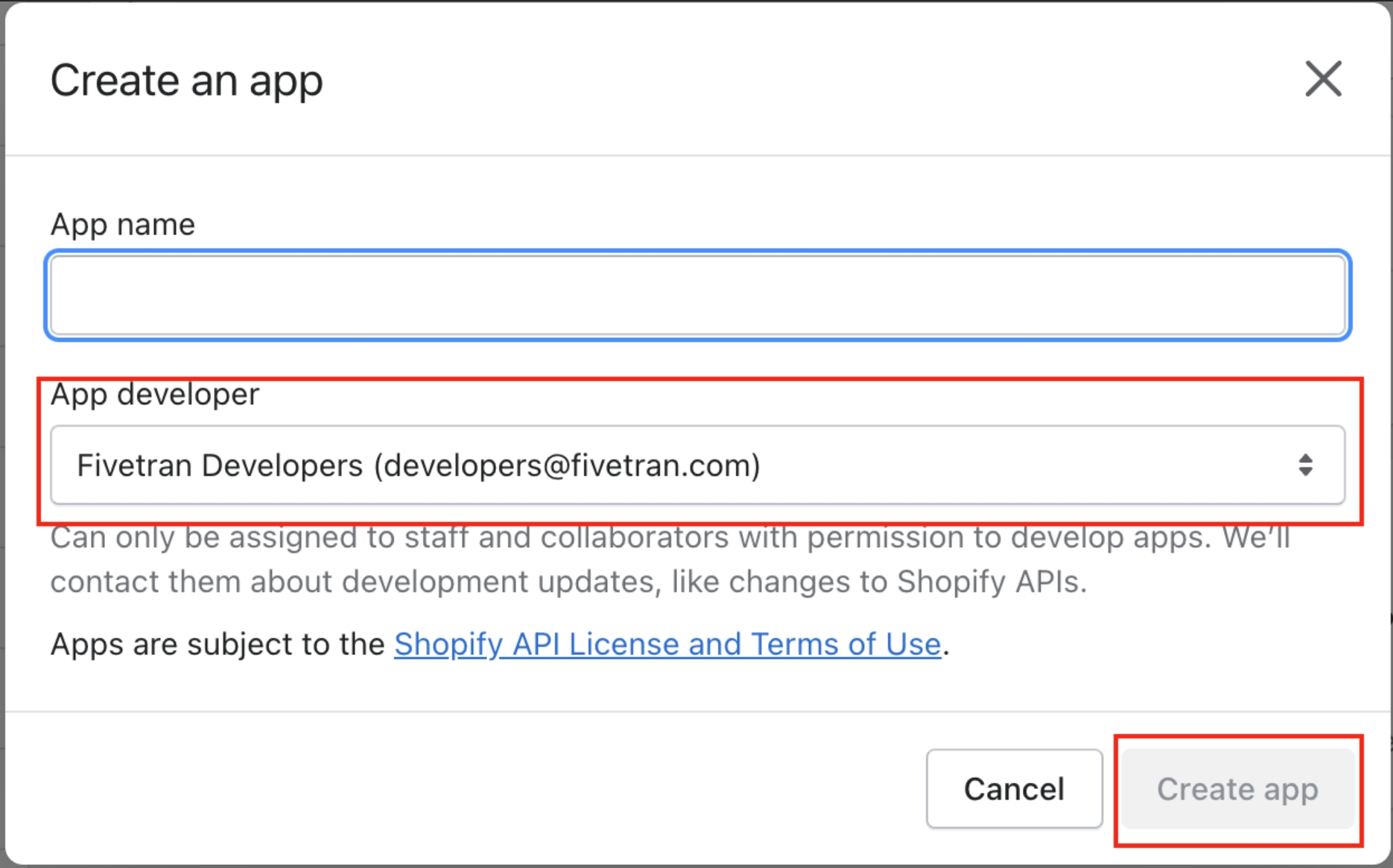 In the App developer drop-down menu, select the Shopify user email you would like to associate with this action.