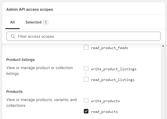 Here, you will need to check the box for each of the below Admin API scopes. Once completed, click Save in the upper right hand corner.