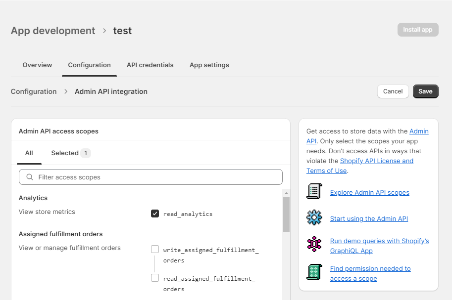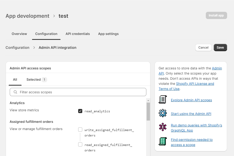 Prior to following the setup instructions below, you will need to enable custom app development in your Shopify account. Only a Shopify store owner or a staff member with the Enable app development permission can make this update.