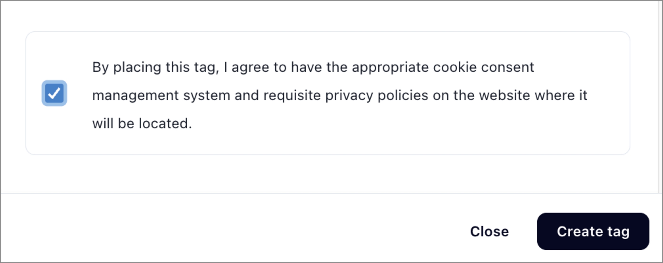 After updating your website privacy policy, check the agree to terms box and select Create tag.