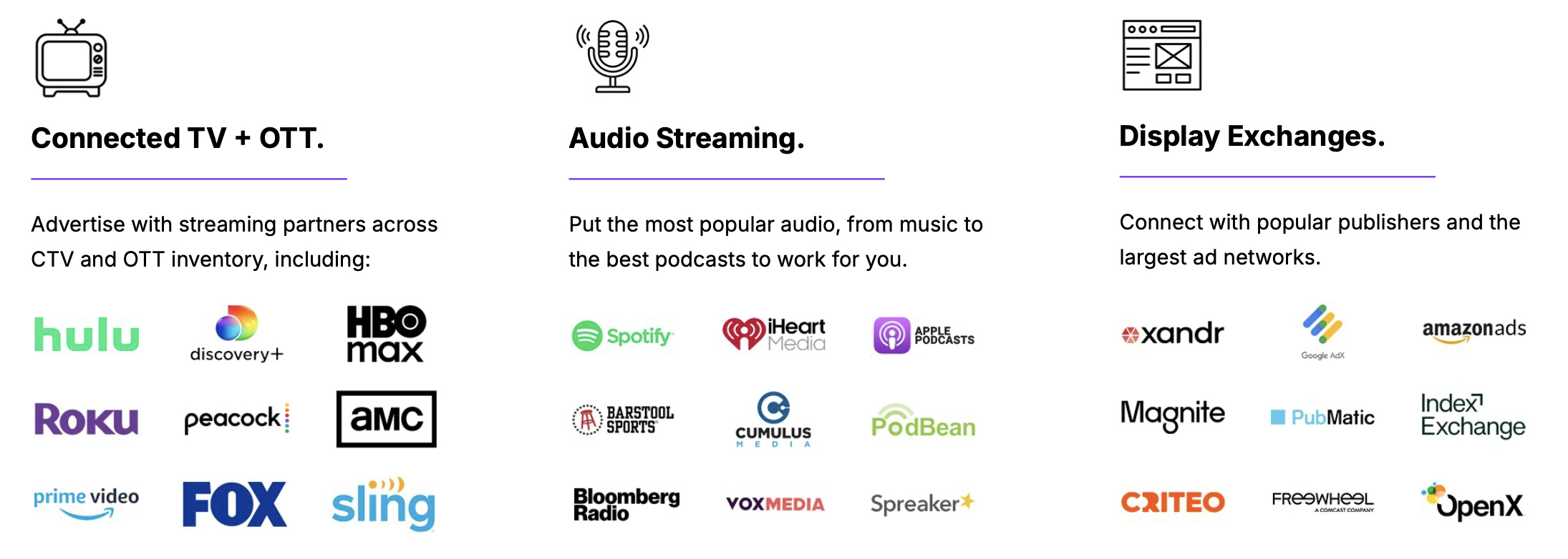 * Launch campaigns across Connected TV (CTV) and Over The Top (OTT) streaming platforms.